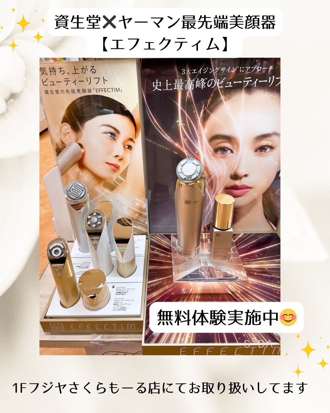 2025年10月1日 / 最終更新日 : 2025年10月1日 さくらも~る ショップニュース 1F フジヤ 【最新美容機器『エフェクティム』体験会のお知らせ】 資生堂の先端皮ふ研究×スキンケアと美容機器メーカーのヤーマンが共同開発した最新美容機器『エフェクティム』当店にてお取り扱い中です。1回たったの6分で2億回のエネルギーを肌の深層へ届けます。 フェイスラインがすっきりしハリと透明感、うるおいに満ちあふれた肌へ導きます! ~感動体験しませんか?~ 日時:10月5日(日)・25日(土) 受付時間:11:00~18:00(所要時間20分) 年齢を超えた新たな美しさ、ビューティーリフトを叶えます!ご来店お待ちしております。