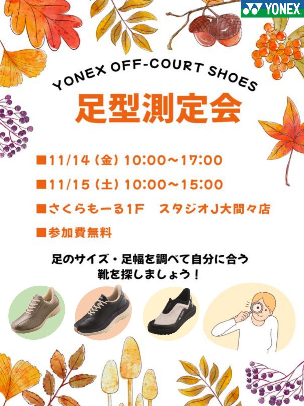 2025年11月14日 / 最終更新日 : 2025年11月14日 さくらも~る ショップニュース 1F スタジオJ【大好評!足型測定会開催】 ヨネックスの専門員が精密機器で足のサイズ、足幅を測定。 あなたの足に合った靴選びをアドバイスいたします。先着20名様限定! 測定と簡単なアンケートにご協力いただいた方にヨネックスオリジナル「マスク」をプレゼント!
